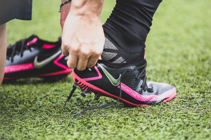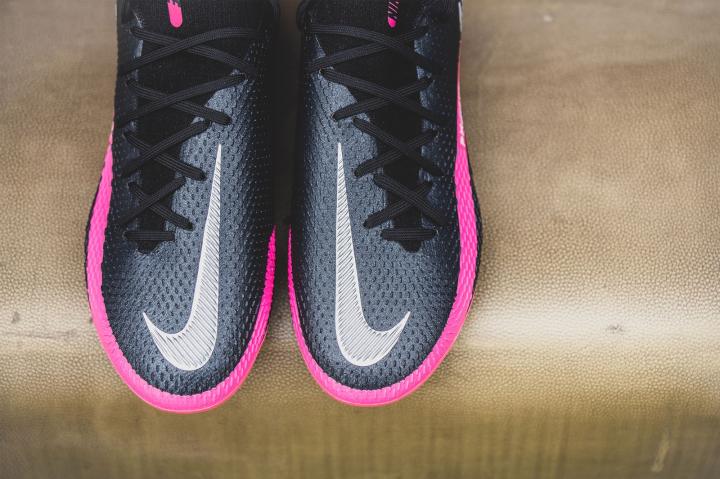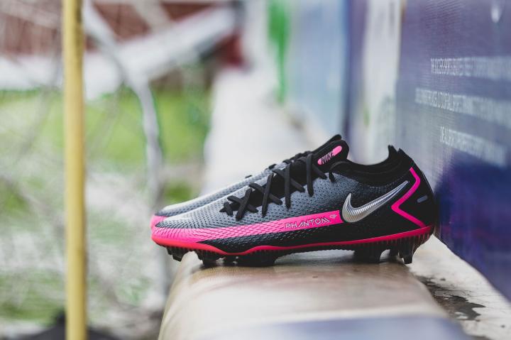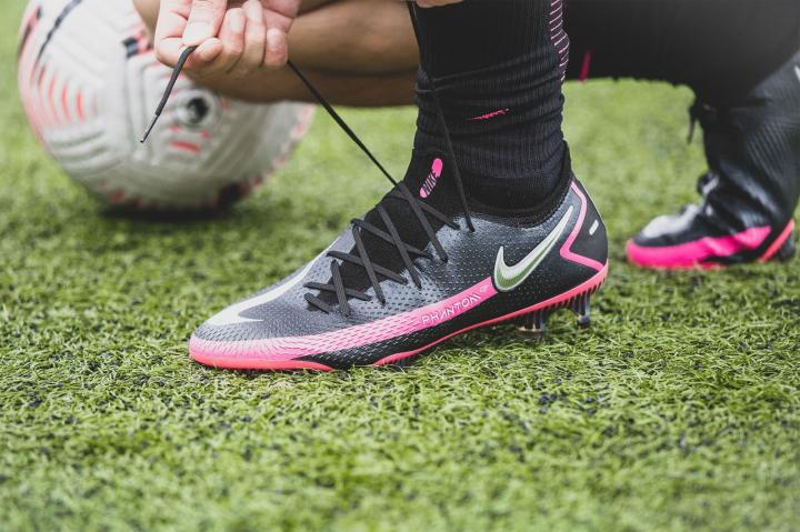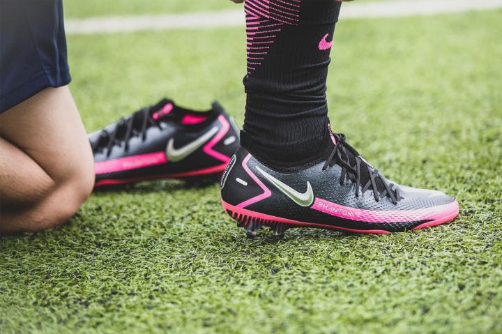 评测之前我们再来回顾一下Phantom GT Elite FG的基础配置,作为Phantom系列Vision和Venom战靴的合体加强款,耐克是使用了什么设计完成兼容并包、功能大统的?首先,Phantom GT Elite的鞋楦在之前Phantom系列的基础上有所调整,前掌宽度提升、空间变大,脚型的兼容性比较出色,宽脚也可以尝试,这一点保证了多位置的球员可以选择,而不像Mercurial系列一样更强调包裹性、速度感。但实际上,现在的Mercurial也趋于全能属性,从门将到前锋,穿着的球员实在太多了。新款Phantom要做出区别,那鞋面一定要有比较明显的“独特属性”,于是就有了第二点亮点设计——鞋面的控球辅助颗粒。