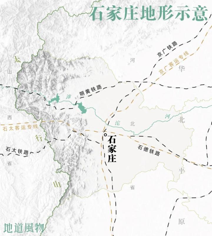 从地图上看,地处河北省中南部的石家庄称得上“依山傍水”。和北京一样,石家庄西高东低,西上太行山地,东入华北平原。在西边更高处,发源于黄土高原的海河向东奔腾而下,数十条支流横切太行山,在太行山东麓形成了一连串富饶的冲积扇。被称为“小黄河”的滹沱河,从石家庄市区北面滚滚而过。