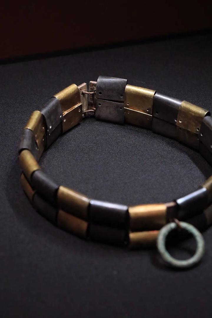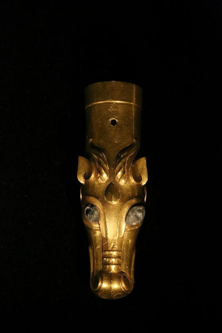 ▲ 图1:石家庄平山县中山国遗址。摄影/石耀臣;图2、3:河北省博物馆藏,中山王厝墓出土的龙首形金衡帽和金银狗项圈。摄影/动脉影