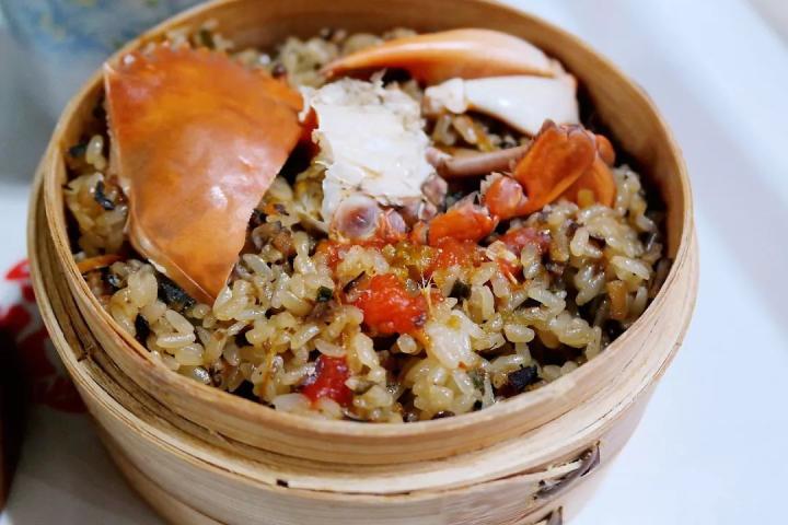 膏蟹除了常见的清蒸、姜葱炒之外,到了福建又成就了一道当地美味:红蟳饭。