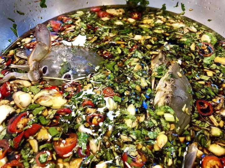 宁波呛蟹,选用带有红膏的梭子蟹,以水盐4:1的比例配置腌水,还有人会倒入些许白酒,将洗净后的梭子蟹放入腌水中,盖好盖子,等待15个小时,梭子蟹就腌制成熟了。