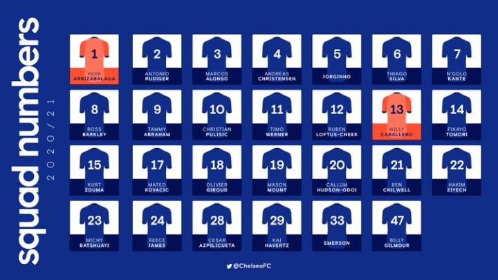 切尔西官方公布了新赛季阵容和球衣号码,普利希奇改穿10号,22号则交给了新援齐耶赫,蒂亚戈-席尔瓦将身披6号战袍,维尔纳11号、哈弗茨29号、奇尔韦尔21号。