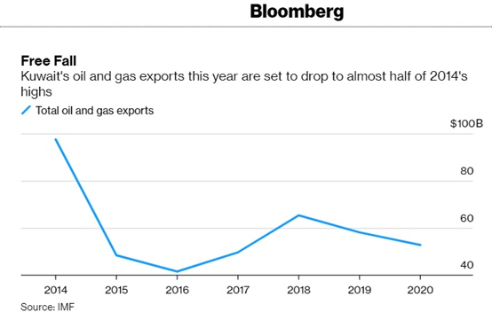 油价低迷,对科威特这样的石油出口国影响最大。2020年,科威特石油、天然气出口额,只有2014年的三分之一。