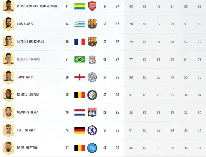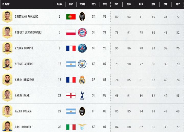 北京时间9月10日,著名足球电子游戏FIFA 21公布了新作中前一百名球员的能力值排名,以下是前锋(ST+CF)位置上的排名情况,C罗、莱万分居一、二位。