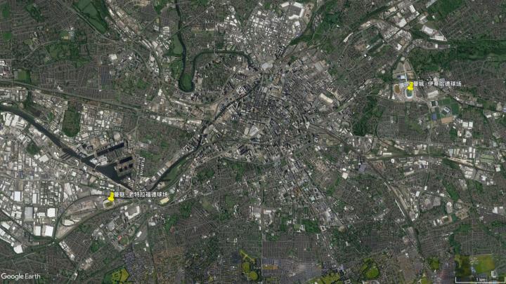 曼市双雄分别位于城市的两端,曼联队在西南部的工业区,曼城队则在东北部新开发的体育城内,这里曾经是英联邦运动会的主要比赛场地之一。