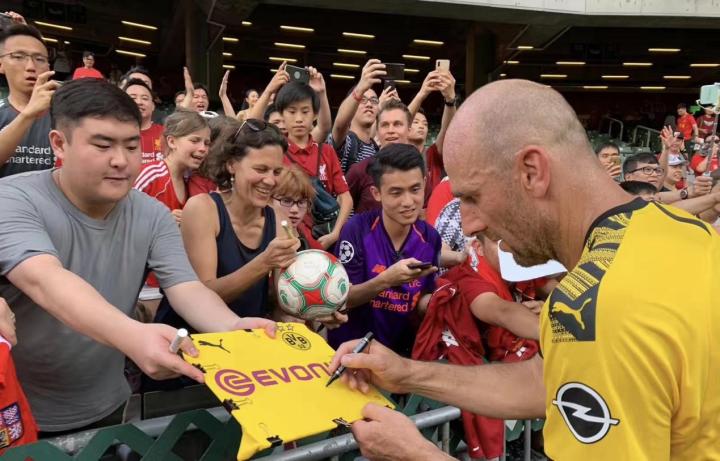 总体来说,我们历次亚洲之行都收获了巨大的成功。就像我之前所说的,在2015、2016和2017这三年的亚洲行,我们可以看到我们的球迷基数在不断扩大。不少球迷来到机场迎接球员,或是想尽一切办法在球员下榻的酒店门口索要签名。去年,多特蒙德的传奇球星和利物浦的传奇球星组成的队伍在香港举办了一场表演赛,多达两万一千名观众入场观赛。2016年的中国行并不是个例,每次我们的队伍来到中国都能收获巨大的成功。我最大的愿望是明年能把多特蒙德的队员带到中国。