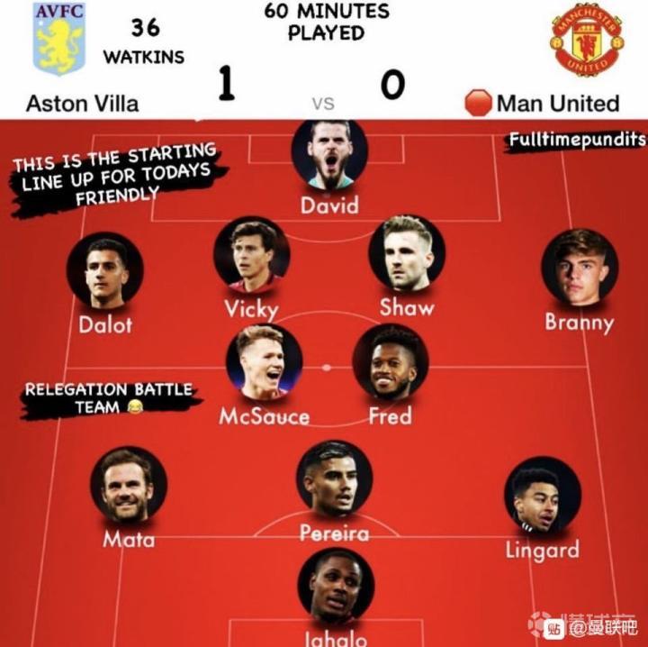 【热身赛】曼联0-1维拉,首发阵容如下: