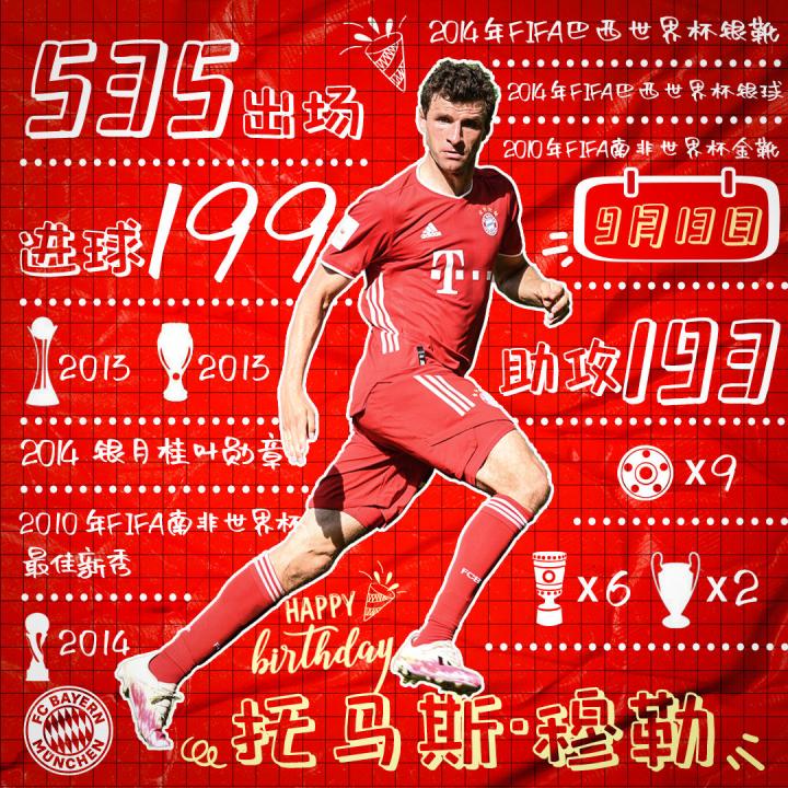 今天是托马斯·穆勒31岁生日! 如今已过而立的二娃,既是球队的开心果,又是球队传奇。 回忆往事还历历在目: 2008年,穆勒在对阵汉堡的比赛中,替补克洛泽登场,第一次登上德甲的舞台。 2009年,穆勒正式成为一线队的一员。欧冠对阵葡萄牙体育,穆勒替补登场,打入欧冠处子球,回到联赛,面对多特蒙德,又替补登场打入德甲处子球,并独中两元。 2010年,面对波鸿,穆勒完成一线队的首个帽子戏法。 同年穆勒得到国家队征召,成为世界杯历史上最年轻的金靴,并拿下最佳新秀。 2012年,对阵切尔西,穆勒头球顶进拜仁欧冠历史第50球。 2013年,穆勒以23岁254天的年纪,帮助球队拿下队史第五座大耳朵杯,并获得当年三冠王。 2014年,穆勒上演巴西世界杯第一个帽子戏法,拿下世界杯银靴奖和银球奖,并帮助德国队拿下第四座世界杯。 2016年,对阵尤文图斯,穆勒打入一球,超越盖德·穆勒,创造德国球员欧冠进球新纪录。 2020年,穆勒以20个助攻,刷新德甲单赛季助攻纪录。并再次帮助拜仁拿到欧冠冠军,以及三冠王。