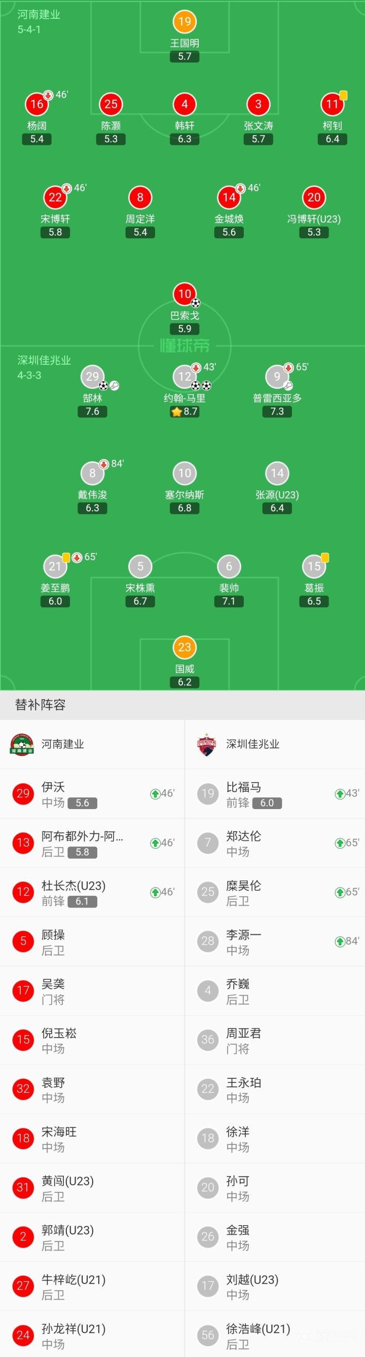 河南建业首发:19-王国明、11-柯钊、4-韩轩、25-陈灏、3-张文涛、20-冯博轩(U23)、16-杨阔(46'13-外力)、8-周定洋、14-金城焕(46'29-伊沃)、10-巴索戈、22-宋博轩(46'12-杜长杰(U23))