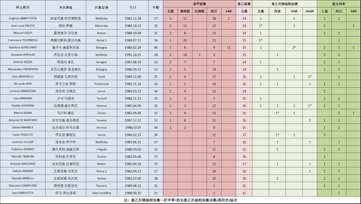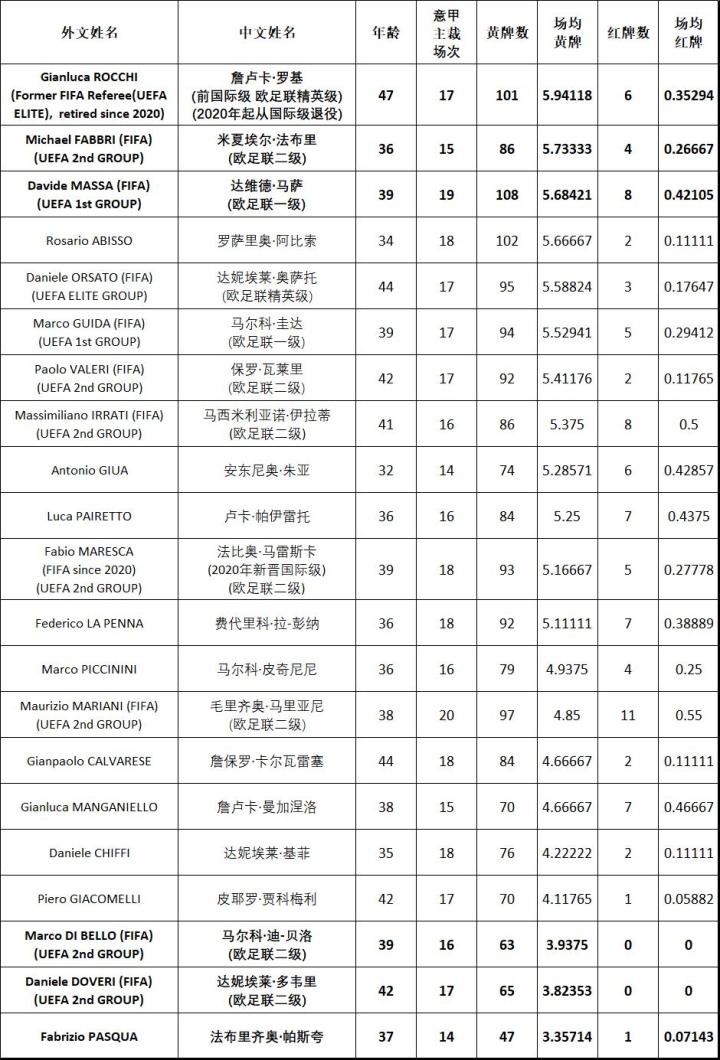 (图)本赛季意甲裁判员各项赛事执法数据统计