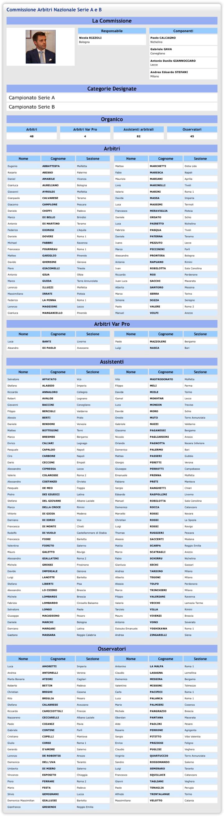 新赛季意甲和意乙裁判员共有48人,本赛季名单中的意甲裁判罗基以及意乙裁判巴罗尼和米内利均不会出现在下赛季的阵容中。下赛季的新晋裁判共5位,包括马泰奥·加里利奥(Matteo Gariglio)、马泰奥·马尔凯蒂(Matteo Marchetti)、弗朗切斯科·梅拉维利亚(Francesco Meraviglia)、达妮埃莱·帕泰尔纳(Daniele Paterna)以及阿尔贝托·圣托罗(Alberto Santoro),这5位裁判大部分时间应该还是先在意乙执法,表现出色的估计会得到一至两场意甲执法机会。其余原意乙裁判估计会执法更多的意甲联赛的场次,尤其是年轻的裁判员,也会给意甲注入一些新鲜血液,至于新赛季哪位意乙裁判会常驻意甲,还要等赛季开始后观察一段时间的裁判选派才可得知。