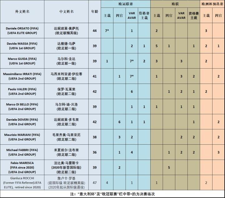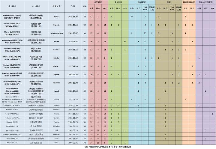 罗基后有奥萨托接班,那奥萨托之后呢?奥萨托目前也已经44岁了,离退役不远了,执法明年的欧洲杯应该不成问题,但其身体条件能否在22年达到执法世界杯的要求还要画个问号。目前欧足联第一级中的意大利裁判有马萨和圭达,两人均为39岁,马萨已在第一级徘徊多年仍未得到晋升,而圭达则是本赛季起刚刚升至一级。本赛季马萨执法了5场欧联正赛以及2场欧预赛,圭达除了3场欧联正赛以及2场欧预赛之外还执法了一场欧冠小组赛。