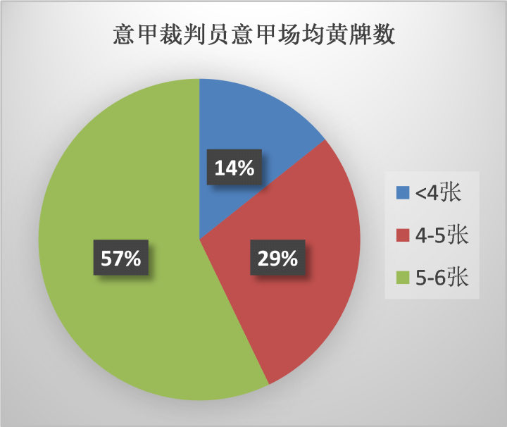 意甲与西甲裁判执法风格相似,出牌频率较高。据编者统计,本赛季意甲赛场上共出现了1875张黄牌以及93张红牌,场均黄牌4.93张,比上赛季增长了5%。在欧洲四大联赛中,这个场均黄牌数也仅稍低于西甲,排名第二高。在21位意甲裁判中,只有帕斯夸、迪贝洛和多韦里的场均黄牌数在4张以下,其他裁判员平均每张都要出示4张及以上的黄牌。