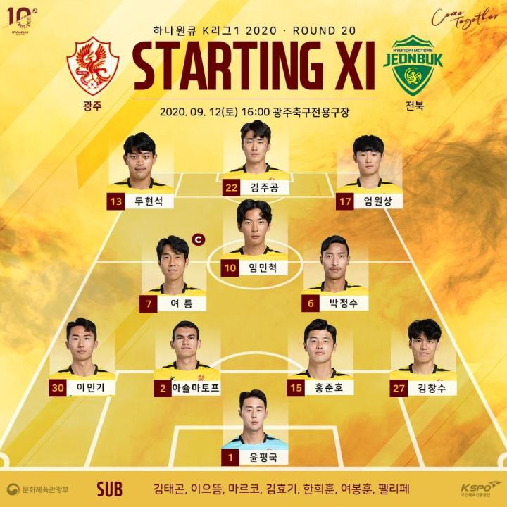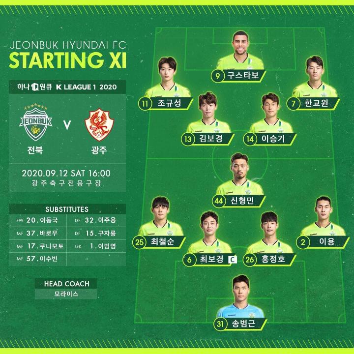 我们先把目光聚焦到光州,9月12日下午,2020赛季韩国足球K1联赛第20轮光州FC和全北现代汽车的比赛在光州专用球场进行,6轮不败的光州迎来3轮不胜的全北,如果在赛季初,这场比赛外界一定会对全北充满信心,但由于近期全北的表现,还是让这场比赛的主队多少有了一些想法。尽管大将韦礼安停赛,但光州并没有慌乱,他们雪藏了费利佩,派遣速度型前锋金周功登场,将反击的策略进行到底。而全北现代汽车,则是雪藏了古斯塔沃和巴罗在首发中,意图后发制人。两队的策略也最终影响了比赛的最终进程。