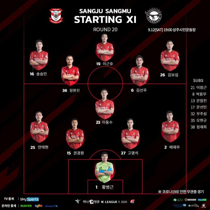 提前锁定前六的尚州尚武在主场迎来了城南FC的挑战,考虑到一周双赛,尚州尚武进行了大面积的轮换,除了权敬原和安邰铉外,其余主力球员都没有进入首发。而城南FC则是用托米替代了停赛的金贤圣,其余球员还是维系了上轮击败全北的主力框架。这样的排兵布阵可以看出,城南对于胜利的极度渴望。