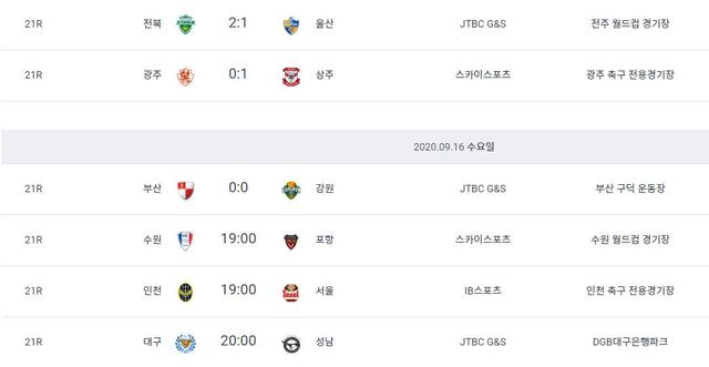 本轮诞生了最惨烈的一场比赛,本场比赛之所以“惨烈”不是因为进球多,而是因为犯规多,这就是釜山和仁川的较量,这场比赛双方将足球场变为角斗场,7黄2红创下本轮之最,而比分,自然是乏味的0-0。对于志在前六和希望保级的球队来说,这场比赛可谓是两败俱伤。釜山方面本场比赛金玄出任首发中锋,朴钟佑停赛后的空缺由上轮打入绝平头球的金帧铉替代。而仁川方面则是派遣出了上轮拿下江原的全主力,志在三分。