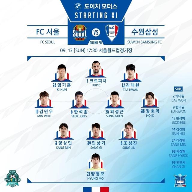 本轮的焦点战是9月13日韩国的“国家德比”FC首尔和水原三星蓝翼的较量,赛前水原三星蓝翼新官宣了主帅朴建夏,这场比赛能否率队取胜也成为了衡量朴建夏能力的重要指标。自2015年6月后,水原三星蓝翼在联赛层面对首尔17战难求一胜,外加上首尔代理主帅金浩荣率队后主场2胜1平保持不败,水原能否打破首尔的金身也是比赛的一大看点。本场比赛,首尔方面奥斯马尔复出,而水原则是雪藏了塔加特和亨利,U22小将金泰焕首发登场,主打343的朴建夏也希望能够吃掉首尔。