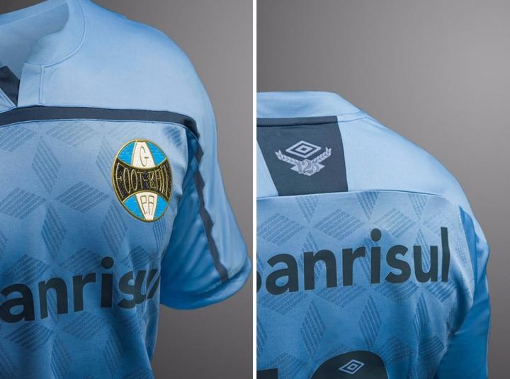格雷米奥全新第二客场球衣以作为俱乐部象征的天蓝色为主色,球衣正面与背面加入源自umbro Logo的菱格花纹,让球衣看起来更具复古感。球衣胸前放置一枚复古俱乐部徽章,展现格雷米奥俱乐部所拥有的深厚历史底蕴。3D热压工艺打造的俱乐部徽章细节精美且充满质感。