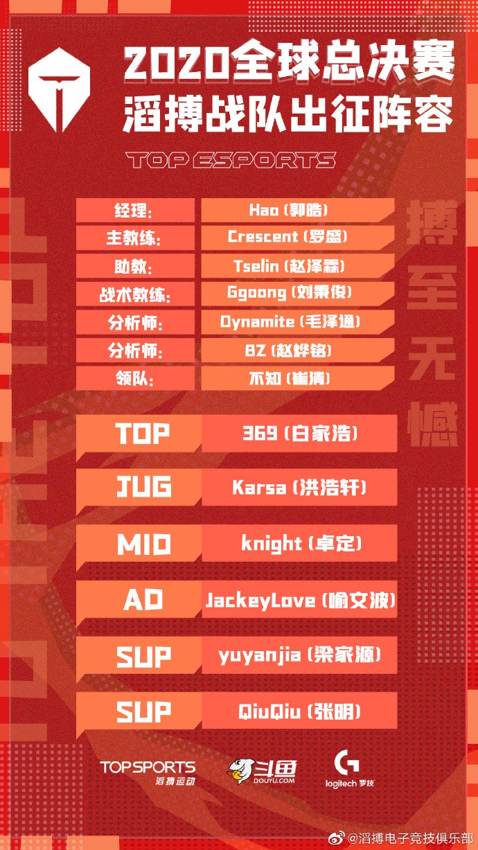 滔搏战队官宣S10出征阵容名单&小组赛赛程峡谷全视野 @懂球帝2020-09-17 21:34【滔搏战队官宣S10出征阵容名单&小组赛赛程】上单369、打野Karsa、中单knight、下路JackeyLove、辅助yuyanjia、QiuQiuTES将在10月3日打响小组赛揭幕战!对阵FLY!加油!展开更多