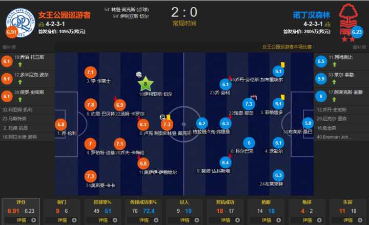 女王主打4231,第一场比赛主场2比0干净利落拿下英冠算是比较有实力和名气的森林,球队阵容比较稳定,三条线都有比较靠谱的球员坐镇。