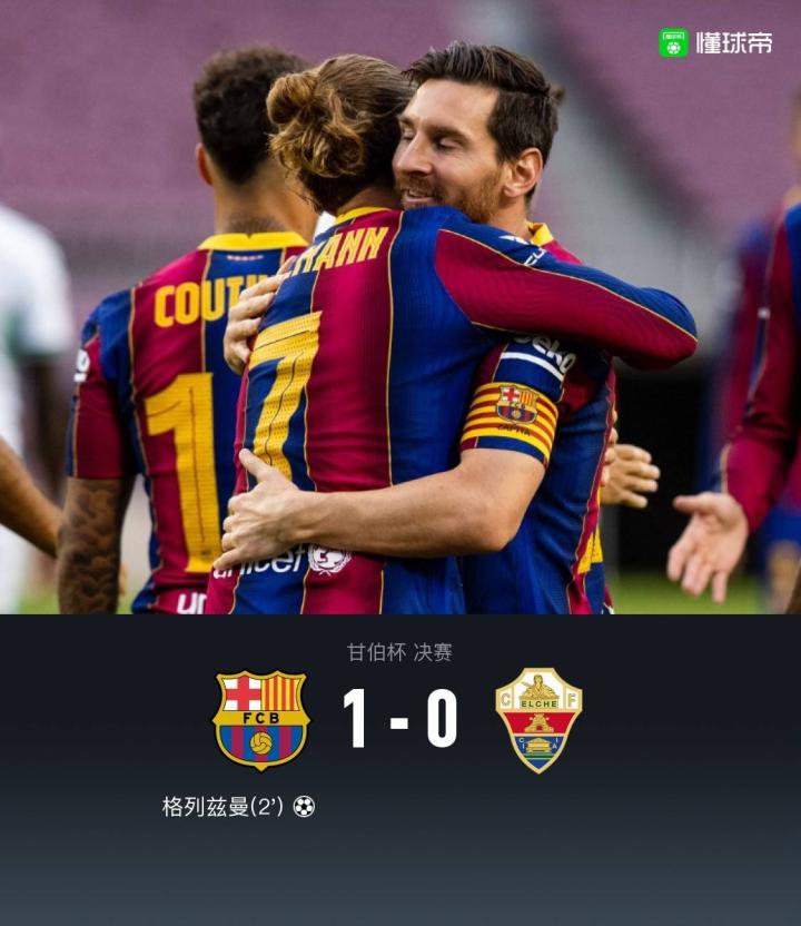 巴萨1-0埃尔切夺甘伯杯冠军,格列兹曼闪击制胜
