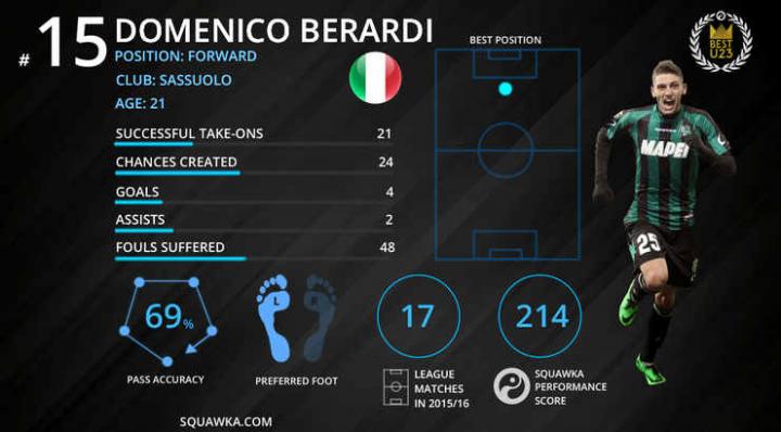 著名足球网站Squawka评选了目前23位年龄在23岁以下年轻有为的球员,这些球员前途无限,已经成为了世界瞩目的焦点。今天,为大家带来的是排名第15位的球员——意甲萨索洛队小将多梅尼科-贝拉尔迪。