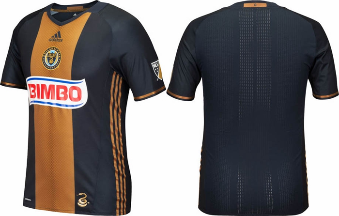 新赛季费城联合主场球衣沿用了球队传统的海军蓝与金色的搭配,球衣正面是球队标志性的金色竖条纹,条纹上加入了蛇鳞的图案,这与球队队徽中的蛇的形象相呼应。