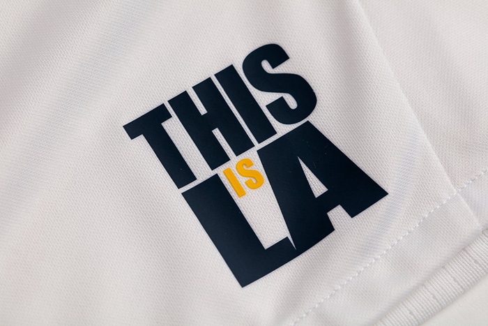 与此同时,V字形衣领和袖口处同样采用了海军蓝和黄色的设计。球衣左下摆的位置上“This is LA”的字样向我们展示这支球队新赛季的决心。