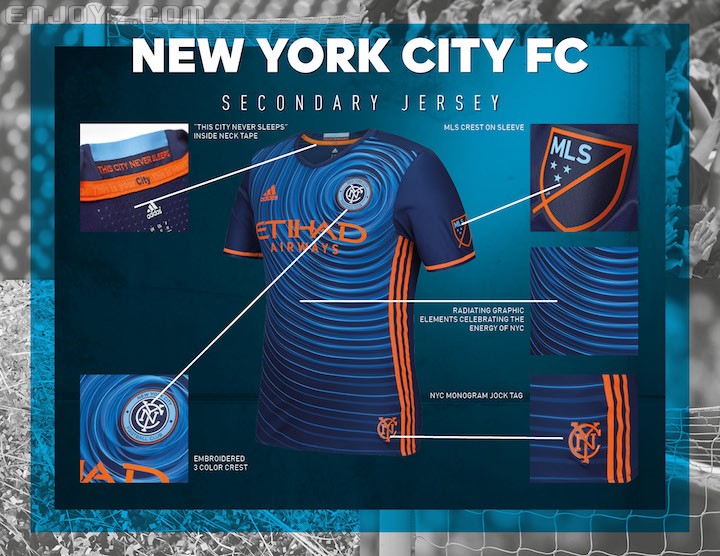 另外,其他球衣细节包括球衣领标,是球迷投票选出的“This City Never Sleeps”和“This is Your City This is Your Club”口号;MLS臂章和纽约城标志性的NYC标志都出现球衣上。