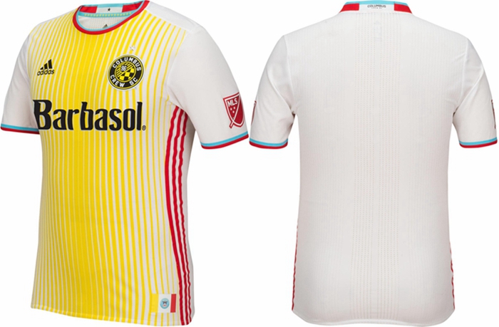 哥伦布机员新赛季客场球衣以白色为底色,球衣正面加入黄色渐变细条纹,与身体两侧的红色阿迪达斯胜利三条纹共同构成了球队所在地哥伦布市的黄白红三色市旗。球衣左下摆处则加入了哥伦布市市旗。
