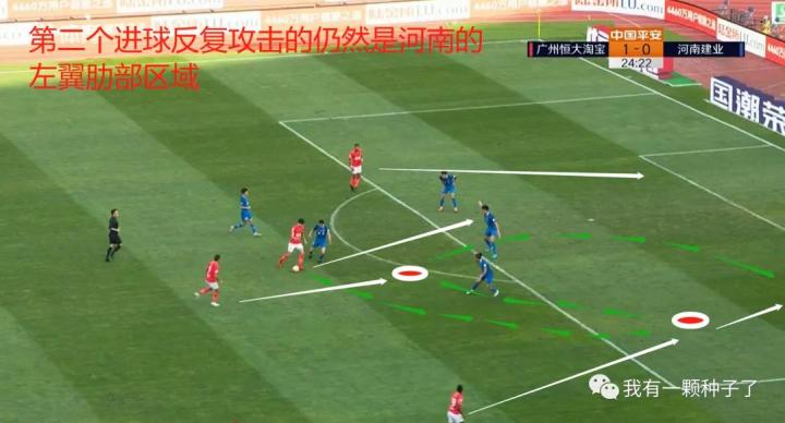 而第二球的攻击则肋部防守漏洞更为明显,由于这是杨立瑜在前场拼抢出来的机会,河南建业的防线显然没有站好防守位置,杨立瑜、费南多、艾克森连续两次弧顶和肋部的连线,即打穿了河南的防线。