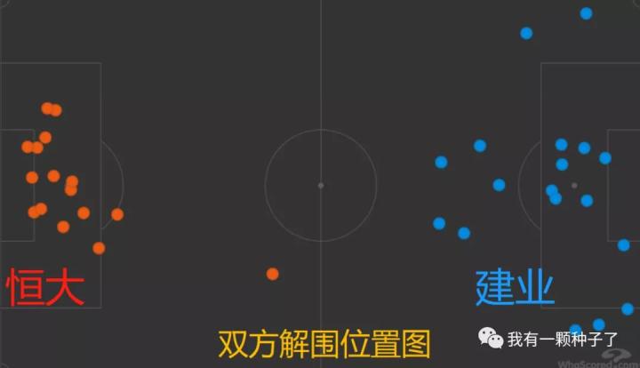 而从双方的解围位置图来看,可以看到广州恒大显然在领先后更多地打起了防守反击,因此建业的解围范围明显更广,而广州恒大由于在后场布防,河南建业只能强攻禁区,而且实际的效果并不算很好。