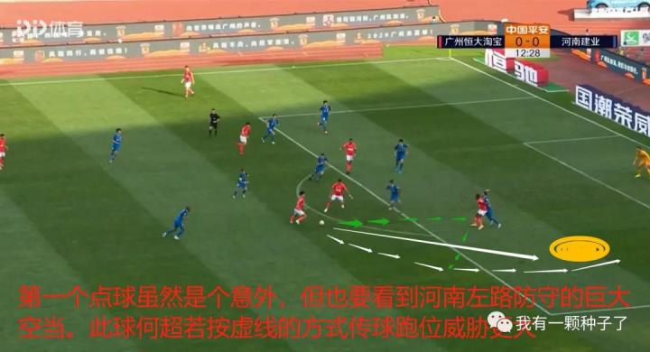 第一个点球虽然是个意外,卡兰加绊倒何超的防守动作虽然莽撞,但从何超接球瞬间的截图我们可以看到,河南建业的左路出现了明显的空当。这一球何超选择自己沿着白色实线箭头的方向带球突进其实并不算是最好的选择,这一球如果他沿着绿色虚线传球,然后自己再沿着白色的虚线箭头跑位的话,造成的威胁还将更大,保利尼奥、艾克森、费南多和杨立瑜的多点包抄已经形成。