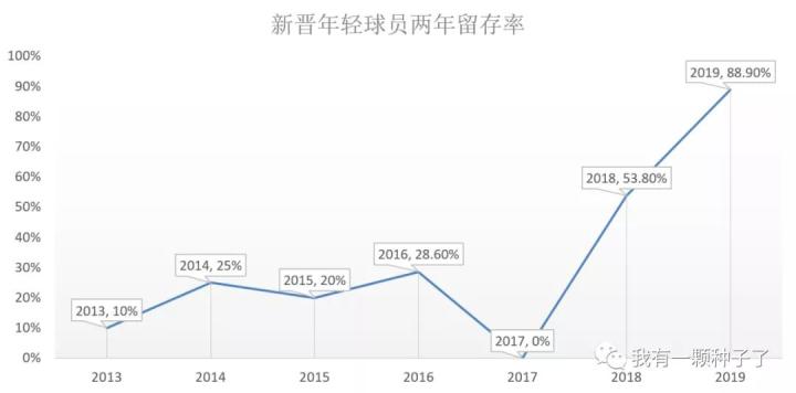 后来有读者提醒我,年轻小将的立足和培养和俱乐部的定位以及主教练的风格有很大的关系。于是我把上一场比赛因为偷懒而没有统计的“新晋年轻球员两年留存率”也统计了一下,数据统计的口径很简单:在该年进入球队大名单的球员,若次年仍留队且最终有过比赛时间,则计算为成功留存。最终统计的结果如下:
