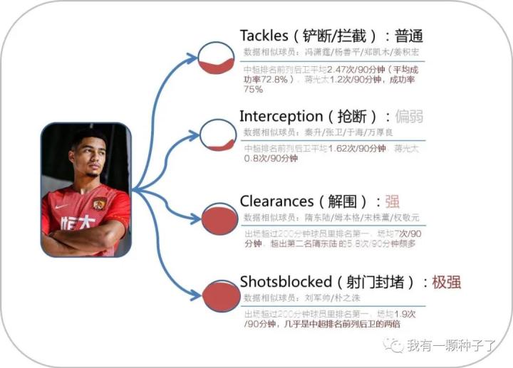 赛季初,我曾经用上赛季蒋光泰的数据分析过他的能力特点。本赛季随着他出场数据的增多,数据的误差也得到一定的修正,但大体的特点仍然类似。本赛季他每90分钟的防守数据是:0.6次Tackles,成功率83.4%;1.1次interception,3.1次clearances,1.1次 shotsblocked。总体来说,仍然是解围和封堵能力强,不太爱好放铲。这和他强大的回追能力和强壮的身体有很大的关系。