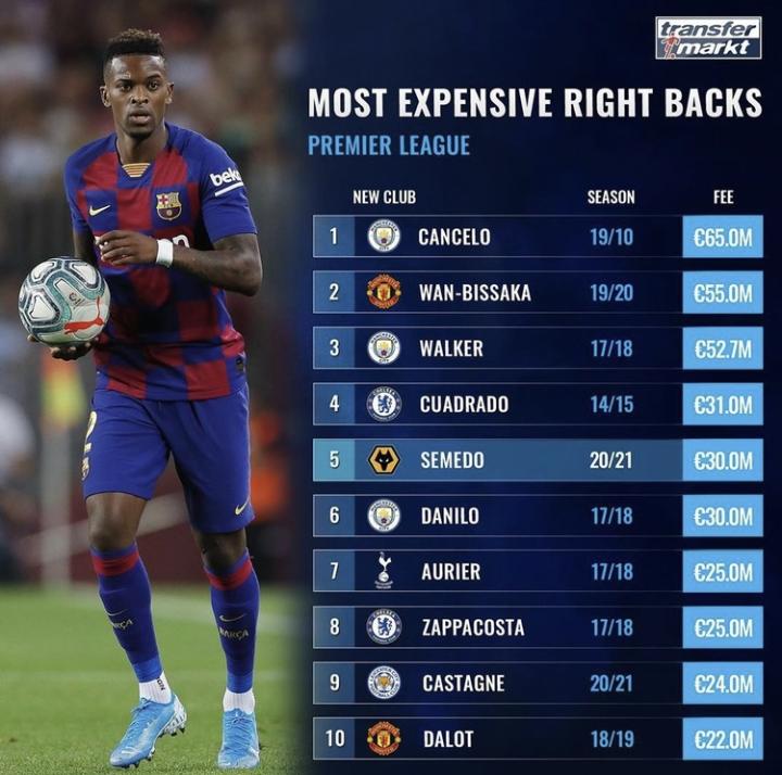 数据网站德国转会市场近日盘点了英超右后卫的转会费,坎塞洛以6500万欧的转会费加盟曼城排名第一,而此前从巴萨以3000万欧加盟狼队的塞梅多则排名第五。