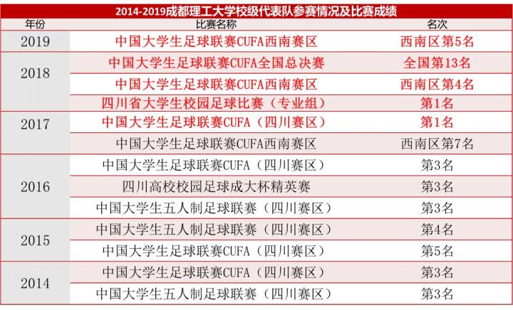 成都理工大学男子11人制足球队重新成立于2014年,成都理工大学足球队是一群对足球满怀热忱的少年组成的,他们秉持着成理人“不甘人后,敢为人先”的精神,在学校高度重视下,教练组精心培育,依托于我校良好的校园足球氛围、较高的足球人口基数,足球队不断在绿茵场上屡创佳绩大放异彩。具体成绩见下表: