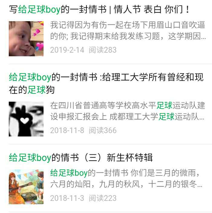也许你也有着和足球boy甜蜜或者心酸的故事,也许你也折服于他的球技,也许你想为他加油助威,无论你是男生还是女生,无论是长篇还是短篇,想想那些在你青春的日子里,让你感动的足球少年,成理足协公众号“给足球boy的一封情书”栏目面向全校征稿。希望通过这一平台的搭建,你可以畅所欲言说出你和足球的故事,期待听到你内心最炙热的声音。