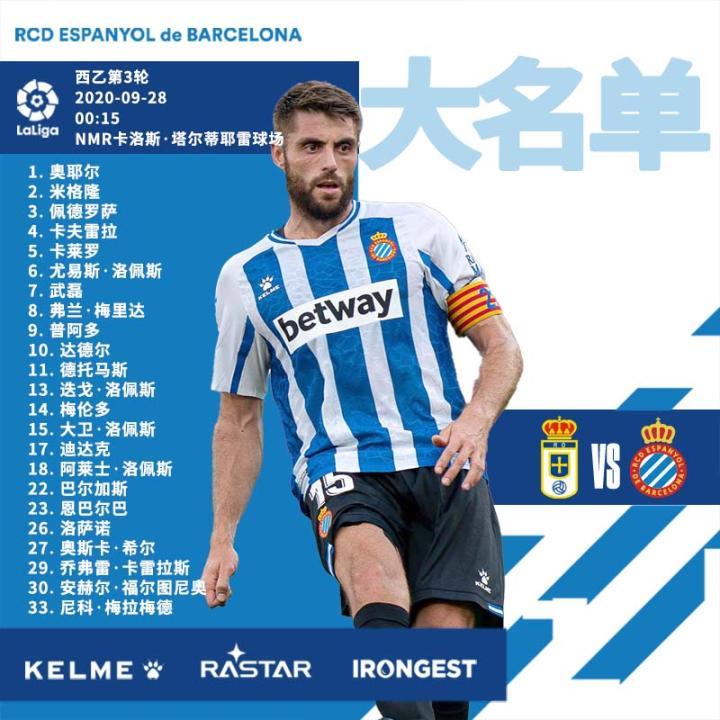 【皇家奥维耶多vs西班牙人】大名单出炉。