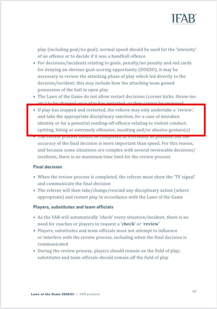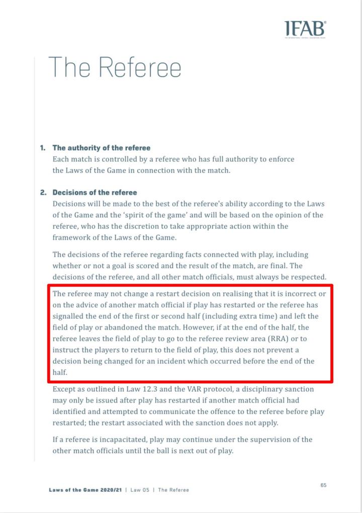 由于目前官方的中文翻译还未出版,只能先放英文版的截图。框中的规则条例翻译成中文大致为:如果比赛已恢复进行,或裁判员已示意上/下半场(包括加时赛)的结束且已离场,或已终止比赛,那么在这种情况下若发现此前的判罚错误或基于其他比赛官员的建议,则不能改变对于比赛恢复方式的判罚。然而,在半场结束时(注意:这里用的词为”the half”,并未特指上/下半场,故对上下半场均适用),如果裁判员离开场地到裁判回看区(RRA)或为了使球员回到场上而离开场地,那么半场结束前的判罚则可以改变。