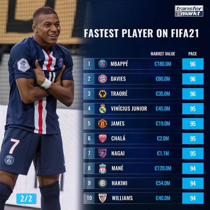 在FIFA 21公布能力值后,德国转会市场网站列出了速度最快球员的榜单,其中,姆巴佩、阿方索-戴维斯和特拉奥雷均以速度96分并列榜首。