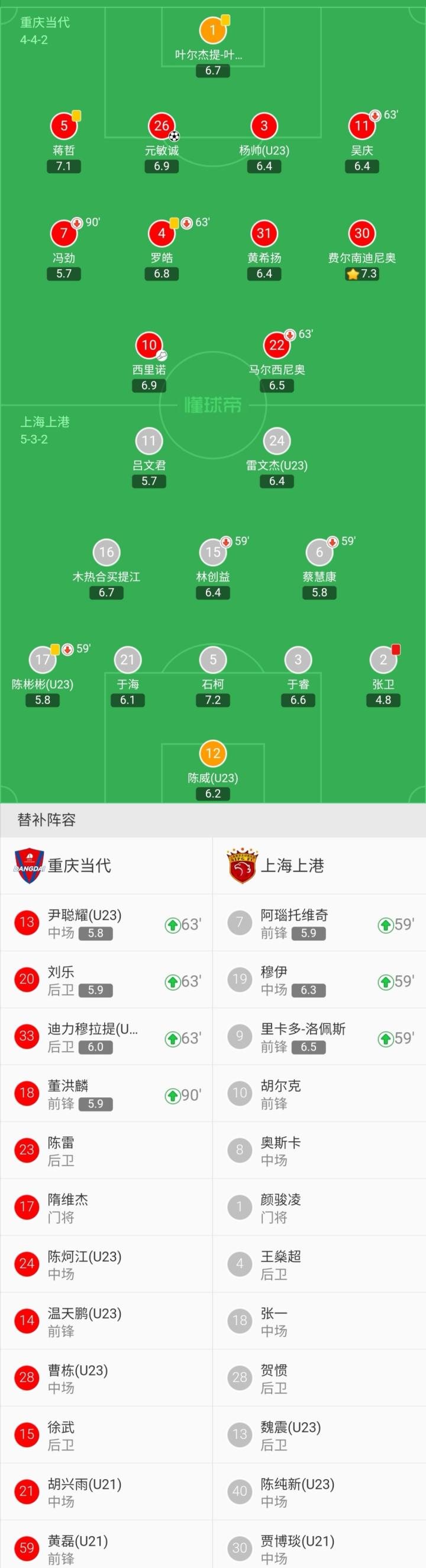 重庆首发:1-叶尔杰提、11-吴庆(63`20-刘乐)、3-杨帅(U23)、26-元敏诚、5-蒋哲、31-黄希扬、4-罗皓(63`33-迪力穆拉提(U23))、7-冯劲(90+2`18-董洪麟)、30-费尔南迪尼奥、22-马尔西尼奥(63`13-尹聪耀(U23))、10-西里诺