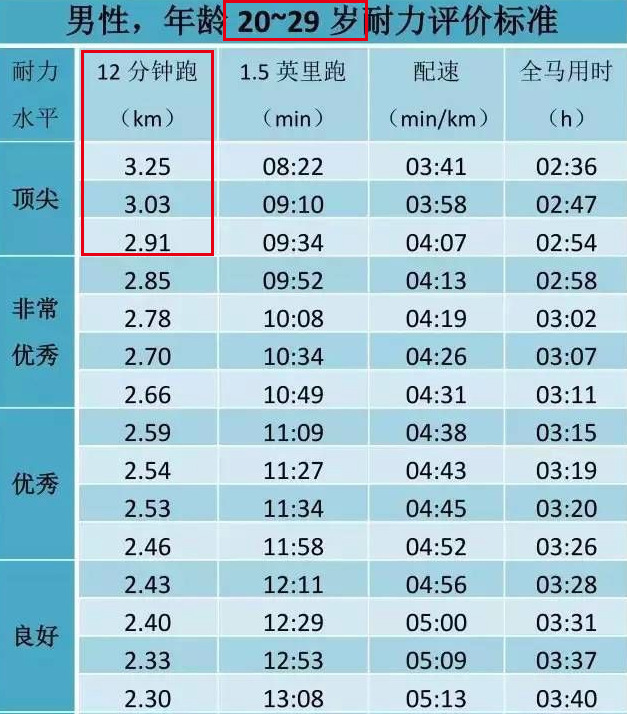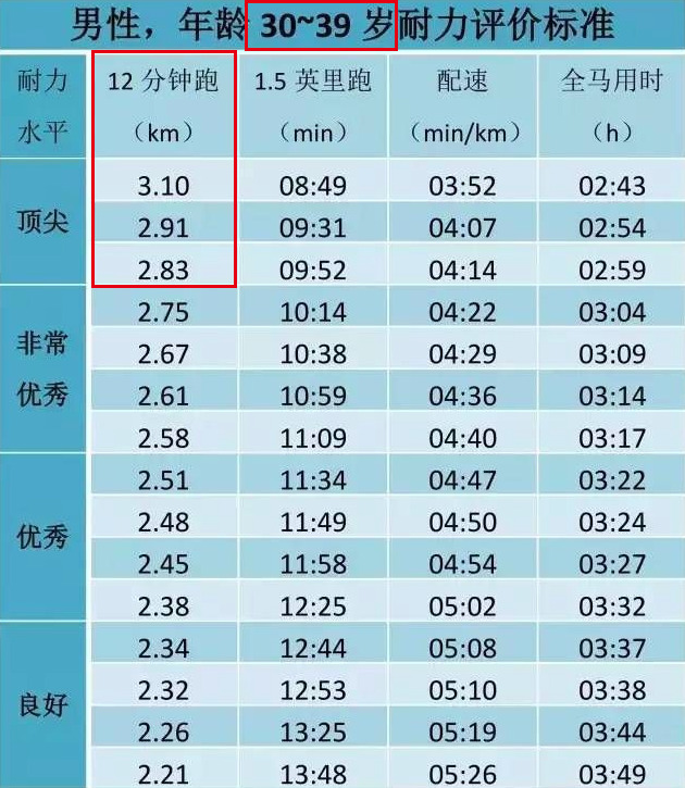 在讨论12分钟跑之前,我们先来看美国有氧运动之父库珀发明的一组12分钟跑测试图——