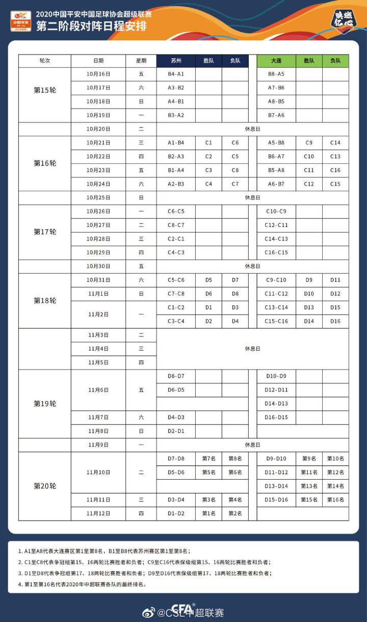 第二阶段的比赛将于10月16日开战,争冠组八队在苏州,保级组八队在大连,通过三轮两回合无主客场进球的淘汰赛排定联赛座次;联赛前三将获得下赛季亚冠资格,降级名额则为1.5个;目前来看,恒大和上港在决赛相遇的可能最大,谁能夺冠将取决于临场发挥和裁判;第三个亚冠名额将在京鲁之战的胜者与苏宁之间产生;保级方面,河南、青岛和天津三队最为危险,泰达大概率锁定一个直接降级名额,而无论哪队出战与中甲亚军的升降级附加赛,保级希望都很大。