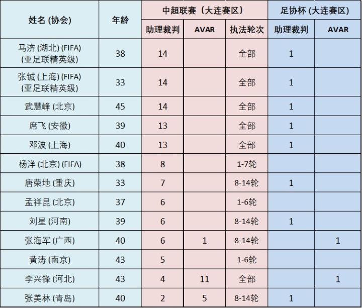 大连赛区共有13位助理裁判员参与执法,仅有6位执法了全部轮次的比赛,其中马济、张铖和武慧峰更是14轮全勤,席飞和邓波在14轮中也执法了13场比赛,而李兴锋则是主要担任AVAR,仅以边裁的身份出场4次。由于边裁人员一度紧缺,上半程甚至出现了杨洋在同一轮执法两场比赛的情况。