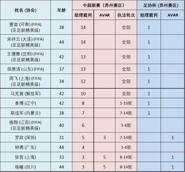 苏州赛区同样有13位助理裁判员参与执法,其中6位贯穿整个第一阶段,这些劳模中包括曹奕等5名国际级助理裁判员以及来自解放军足协的马克喜。苏州赛区助理裁判员的任务同样艰巨,曹奕和宋祥云均实现了14轮全勤,而胡成军则在短短半天时间内先后上场执法了两场比赛,对体能储备的考验极强。
