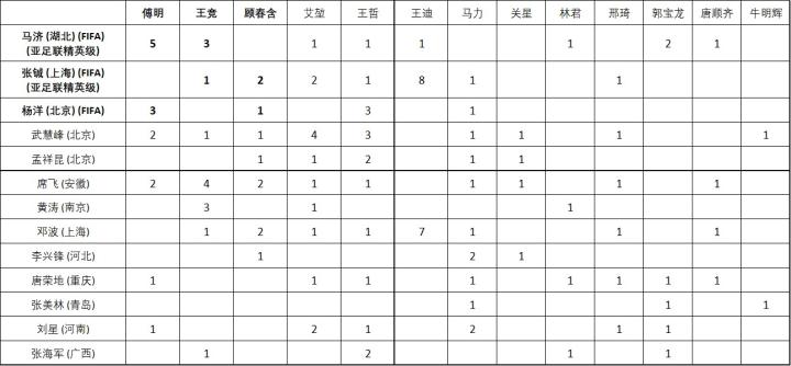 在主裁与助理裁判的搭配频率方面,大连赛区仅有王迪+张铖、邓波以及傅明+马济的组合相对较为固定,其他裁判员担任主裁时则是轮流与各位助理组队。苏州赛区马宁与施翔和王德馨、张雷与宋祥云、沈寅豪与周飞以及石祯禄与曹奕等搭配则经常出现在赛场上。虽然裁判员与助理裁判员由于分赛区以及执法轮次不同等原因,导致一些国际赛事中常用的组合无法继续搭配,但至少在赛区内这样的固定组合执法在一定程度上也会对裁判组成员之间的配合起到积极作用。
