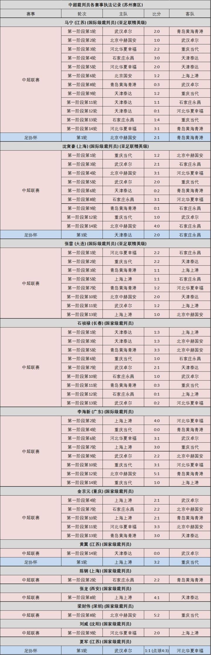 苏州赛区前后共有20位裁判员参与执法,其中包括马宁等4位国际级裁判。虽然我们4位亚足联精英裁判中有3位都在苏州赛区执法,但是总体上足协信任并给予机会的裁判并不多,主裁任务主要由马宁、沈寅豪、石祯禄、张雷、李海新和金京元这六位承担。马宁在14轮比赛中仅有2轮未担任主裁,还担任过1次四官和5次VAR,而沈寅豪在中途缺席两轮比赛的情况下也完成了9场中超加1场足协杯的执法,可见任务量之大。