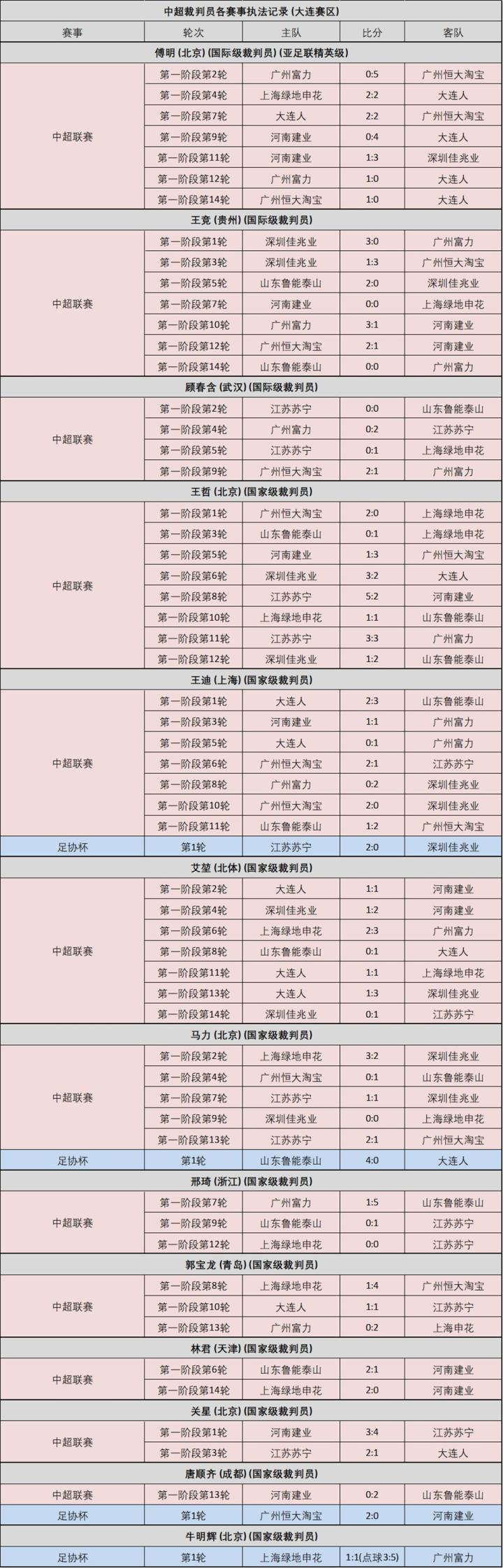 共有19位裁判员参与到了大连赛区的执法工作中,包括傅明、王竞和顾春含这三位国际级裁判在内,其中12位裁判员得到了执法中超的机会。虽共有19人,但由于裁判均为兼职(除三位职业裁判外),都有各自的本职工作,很多裁判请两个月长假较为困难,亦或是有中甲执法任务,无法在赛区封闭执法所有轮次的比赛。