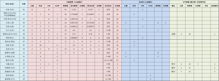 其实整个阶段中裁判们的任务都相当紧凑,由于裁判员负责担任主裁、四官、VAR和AVAR,每个赛区每轮4场,经常有裁判需要在同一轮中连续执法两场比赛。可以看到执法了1-14轮所有比赛的邢琦一共得到了18次任务安排,而执哨场次最多的王哲除了8场主裁外还担任了8次VAR,傅明、王竞、王迪和艾堃则是各执哨了7场比赛,平均每隔一轮就要吹一场。